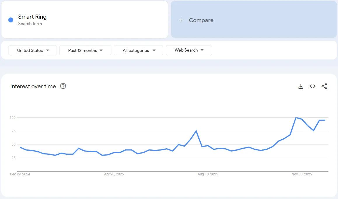 Kijk naar de grafiek hierboven. Dit is het zoekvolume voor 'Samsung Ring' van de afgelopen 90 dagen. Zie je die enorme piek in november? Dat betekent dat Samsung miljoenen dollars uitgeeft aan onderwijs jouw toekomstige klanten. Het inzicht: Het publiek weet nu wat een Smart Ring is. Maar de meeste consumenten zijn niet bereid $399 te betalen. De zoektrend stabiliseert zich, wat betekent dat de ‘hypefase’ voorbij is en de ‘koopfase’ voor betaalbare opties ($50-$80) begint.